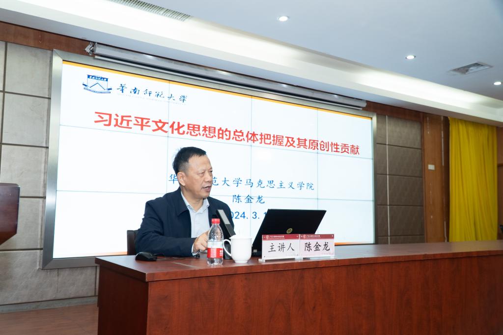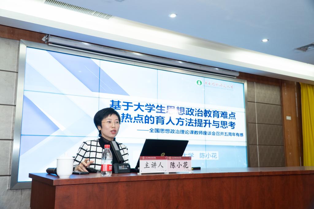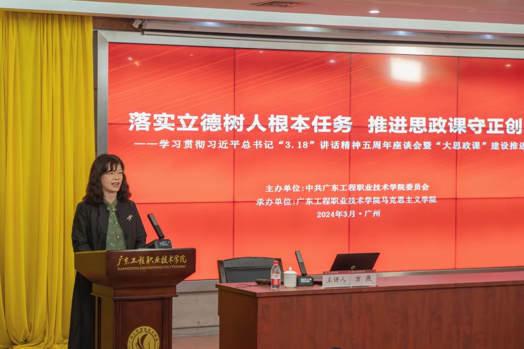座談會(huì)上,教育部“長江學(xué)者”特聘教授、華南師范大學(xué)馬克思主義學(xué)院陳金龍教授談到他當(dāng)年參加全國學(xué)校思政課教師座談會(huì)感受時(shí)說,習(xí)近平總書記的重要講話具有人民情懷、擔(dān)當(dāng)意識、歷史眼光、戰(zhàn)略眼光和世界眼光,五年來,全國高校思政課發(fā)生了格局性變化,取得顯著的建設(shè)成效。隨后,陳金龍教授以題為“習(xí)近平文化思想的總體把握及其原創(chuàng)性貢獻(xiàn)”做了主旨報(bào)告,他從習(xí)近平文化思想的總體把握、堅(jiān)定文化自信作為文化建設(shè)的前提、建設(shè)中華民族現(xiàn)代文明、“兩個(gè)結(jié)合”作為文化建設(shè)方法、全球文明倡議推動(dòng)人類文明發(fā)展五個(gè)方面闡述了習(xí)近平文化思想的原創(chuàng)新貢獻(xiàn);黨的十九大代表、廣東技術(shù)師范學(xué)院網(wǎng)絡(luò)空間安全學(xué)院黨委書記陳小花教授以“基于大學(xué)生思想政治教育難點(diǎn)熱點(diǎn)的育人方法提升與思考——全國思想政治理論課教師座談會(huì)召開五周年有感”為題分享了五年前參加“3·18”座談會(huì)時(shí)的感悟和歷程,以及五年來對大學(xué)生思想政治教育難度熱點(diǎn)育人方法的經(jīng)驗(yàn)與思考;廣東水利電力職業(yè)技術(shù)學(xué)院馬克思主義學(xué)院院長林冬妹教授以“弘揚(yáng)教育家精神 爭做時(shí)代思政大先生——重溫‘3.18’講話精神 凝聚鑄魂育人力量”的主題報(bào)告,與會(huì)老師收獲滿滿。
