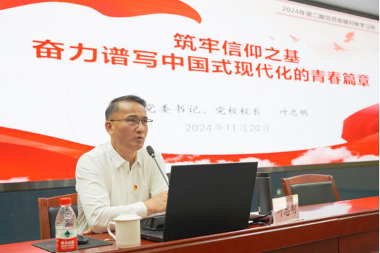 學(xué)校黨委書記、黨校校長葉忠明以《筑牢信仰之基,奮力譜寫中國式現(xiàn)代化的青春篇章》為題講授學(xué)習(xí)班第一講。葉書記引用大量的實例和數(shù)據(jù),結(jié)合黨的二十大報告,闡述了新時代新征程中國共產(chǎn)黨的使命任務(wù)和中國式現(xiàn)代化的本質(zhì)要求;緊緊圍繞學(xué)習(xí)貫徹習(xí)近平總書記在黨的二十屆三中全會上的重要講話精神,深入解析了黨中央全面深化改革的一系列重大部署;以習(xí)近平總書記對青年的寄語和中國共產(chǎn)黨領(lǐng)導(dǎo)百年青年運動的光輝歷程,結(jié)合自身的入黨經(jīng)歷和學(xué)校優(yōu)秀學(xué)生事例,啟發(fā)勉勵學(xué)員們要懷抱夢想又腳踏實地,敢闖敢干追求卓越。葉書記強調(diào),入黨是起點,做合格黨員永遠在路上,要始終堅定理想信念,在校期間德技并修苦練真本領(lǐng),未來在各領(lǐng)域各方面工作中爭當排頭兵和生力軍,爭做有理想、敢擔當、能吃苦、肯奮斗的新時代好青年,在推進中國式現(xiàn)代化偉大實踐中貢獻青春力量。