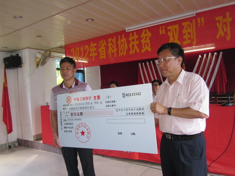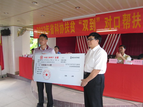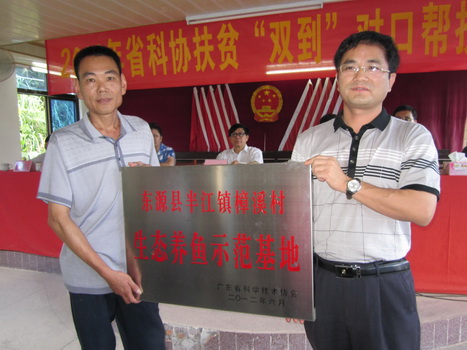 此次扶貧"雙到"幫扶活動(dòng)中,省科協(xié)梁明書記、湯世華副主席和我院黨委李軍副書記分別給樟溪村貧困戶發(fā)放獎(jiǎng)補(bǔ)資金3.9萬;向村委捐贈(zèng)扶持發(fā)展生產(chǎn)專項(xiàng)資金16萬;并為東源縣金溪灣種植專業(yè)合作社頒牌;為樟溪村生態(tài)養(yǎng)魚基地頒牌,向樟溪村村委捐贈(zèng)科普宣傳欄建設(shè)工程款2萬元;向樟溪村村委捐贈(zèng)村委大樓建設(shè)資金1萬元;梁書記和湯主席還分別給幫扶對象賴海棠、何來有同志送上慰問金。