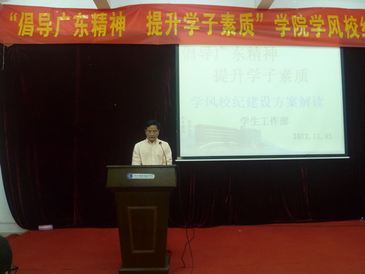 啟動儀式上,張華部長介紹了學(xué)院開展以"倡導(dǎo)廣東精神 提升學(xué)子素質(zhì)"為主題的學(xué)風(fēng)校紀(jì)建設(shè)活動,目的是要用"厚于德、誠于信、敏于行"的新時期廣東精神引領(lǐng)廣大學(xué)生,爭做品學(xué)兼優(yōu)的合格人才。并通過視頻展示回顧了學(xué)院2010-2011年開展學(xué)風(fēng)校紀(jì)建設(shè)活動情況。