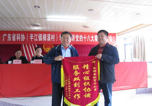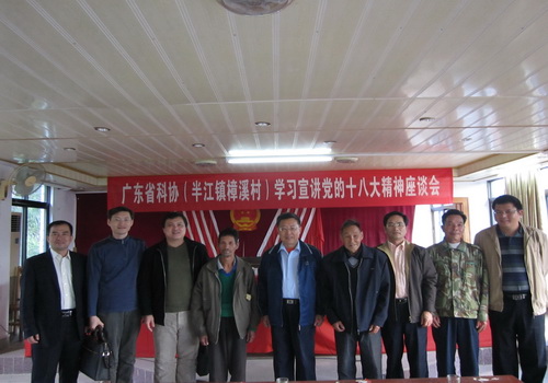 為學(xué)習(xí)宣傳貫徹黨的十八大精神,進(jìn)一步做好扶貧開(kāi)發(fā)"雙到"三年考核驗(yàn)收工作,12月13日,廣東省科協(xié)黨組成員、專(zhuān)職副主席、直屬機(jī)關(guān)黨委書(shū)記湯世華率隊(duì)到河源市東源縣半江鎮(zhèn)召開(kāi)座談會(huì),宣講黨的十八大精神。我院黨委李軍副書(shū)記和部分扶貧開(kāi)發(fā)"規(guī)劃到戶(hù),責(zé)任到人"工作責(zé)任人參加了此次宣講和扶貧開(kāi)發(fā)慰問(wèn)活動(dòng)。東源縣、半江鎮(zhèn)的相關(guān)領(lǐng)導(dǎo),樟溪村黨支部、村委會(huì)及脫貧致富的幫扶對(duì)象等50多人參加了座談會(huì)。省科協(xié)直屬機(jī)關(guān)黨委專(zhuān)職副書(shū)記黎偉民主持座談會(huì)。