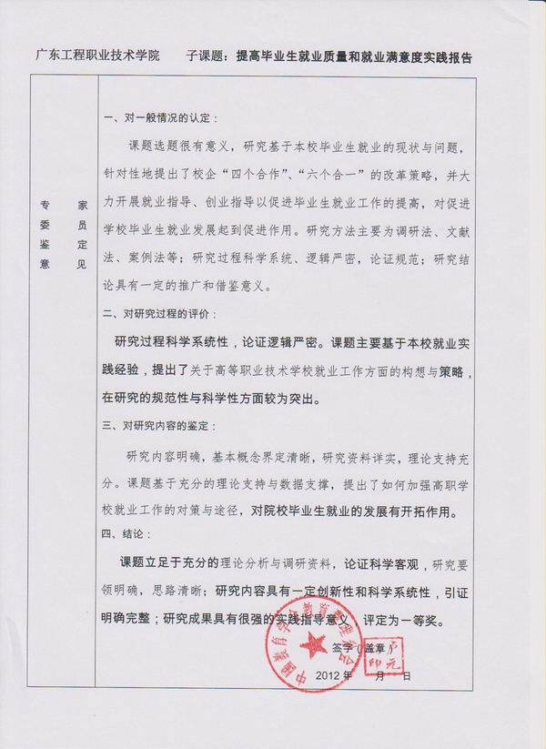 劉文清書記《廣東工程職業(yè)技術(shù)學(xué)院畢業(yè)生就業(yè)指導(dǎo)工作實(shí)踐報(bào)告》的課題于2010年4月開題,歷經(jīng)近3年的研究與實(shí)踐,從創(chuàng)新人才培養(yǎng)模式、創(chuàng)新創(chuàng)業(yè)教育推就業(yè)、就業(yè)指導(dǎo)推就業(yè)、工作保障推就業(yè)、工作實(shí)績推就業(yè)、構(gòu)建"就業(yè)式"校園環(huán)境推就業(yè)六方面,研究基于本校畢業(yè)生就業(yè)的現(xiàn)狀與問題,針對性地提出了校企"四個(gè)合作"、"六個(gè)合一"的改革策略,并大力開展就業(yè)指導(dǎo)、創(chuàng)業(yè)指導(dǎo)以促進(jìn)畢業(yè)生就業(yè)工作的提高,對院校畢業(yè)生就業(yè)的發(fā)展有開拓作用,研究成果具有很強(qiáng)的實(shí)踐指導(dǎo)意義,得到評審專家組的高度好評,在全國教育系統(tǒng)中脫穎而出,榮獲全國一等獎(jiǎng)殊榮,為我院打造全國創(chuàng)業(yè)就業(yè)式校園示范點(diǎn)、全面提升畢業(yè)生就業(yè)質(zhì)量奠定堅(jiān)實(shí)的理論基礎(chǔ)。