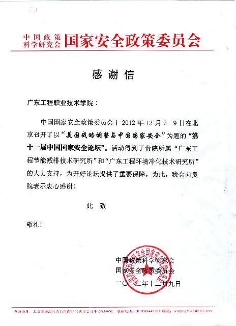 2012年,學(xué)院順應(yīng)節(jié)能減排和環(huán)境 凈化技術(shù)發(fā)展的需要,著眼于推動產(chǎn)學(xué)研合作和協(xié)同創(chuàng)新,成立"廣東工程節(jié)能減排技術(shù)研究所"和"廣東工程環(huán)境凈化技術(shù)研究所"。研究所成立以后,在產(chǎn)品開發(fā)、技術(shù)推廣、技術(shù)服務(wù)等方面積極開展工作,取得良好成效。2012年12月7-9日,中國國家安全政策委員會在北京召開"美國戰(zhàn)略調(diào)整與中國國家安全"為題的第十一屆中國國家安全論壇,研究所為開好論壇提供了重要保障,得到國家安全政策委員會的充分肯定,樹立學(xué)院良好形象,建立友好關(guān)系,為以后開展工作奠定基礎(chǔ)。我院黨委副書記李軍,建筑設(shè)計研究所所長黃貴生,節(jié)能減排技術(shù)研究所所長、環(huán)境凈化技術(shù)研究所所長巫遠(yuǎn)程參加了論壇。