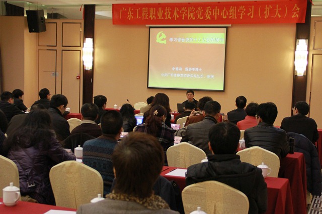 2013年1月8日至9日,學(xué)院在三水溫泉會議中心召開黨委理論學(xué)習(xí)中心組學(xué)習(xí)擴大會。會議邀請省委黨校教務(wù)處長、經(jīng)濟(jì)學(xué)博士余甫功教授作黨的十八大學(xué)習(xí)輔導(dǎo)報告,學(xué)院黨委書記劉文清,黨委副書記、院長勞漢生,其他學(xué)院領(lǐng)導(dǎo)以及各部門負(fù)責(zé)人共48人參加了學(xué)習(xí)會,會議由勞漢生院長主持。