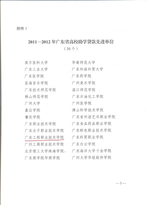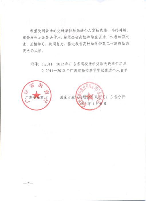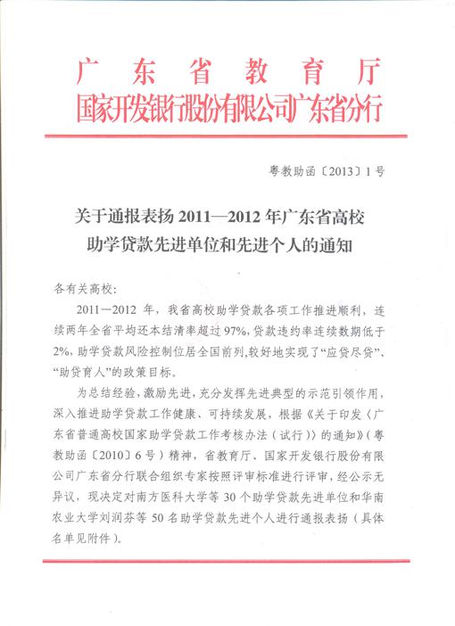 近日,廣東省教育廳、國家開發(fā)銀行股份有限公司廣東省分行聯(lián)合發(fā)文(《關(guān)于通報表揚2011-2012年廣東省高校助學(xué)貸款先進(jìn)單位和先進(jìn)個人的通知》(粵教助函[2013]1號)),通報表揚了全省助學(xué)貸款先進(jìn)單位和先進(jìn)個人,我院榮獲此殊榮,成為30個先進(jìn)單位之一,獲得獎金1萬元。我院助學(xué)貸款校級經(jīng)辦人揭英榮被評為先進(jìn)個人。