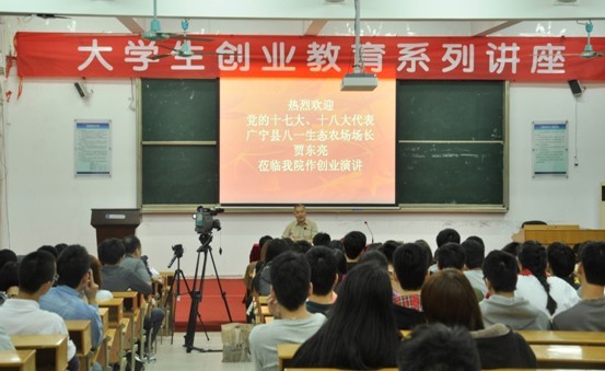2013年3月28日下午,我院大學(xué)生創(chuàng)業(yè)教育系列講座首場報(bào)告會(huì)在教學(xué)樓102報(bào)告廳開講。本場報(bào)告會(huì)由黨的十七大、十八大代表、廣東廣寧八一生態(tài)農(nóng)場場長賈東亮演講。他演講的題目是:自主創(chuàng)業(yè) 艱苦創(chuàng)業(yè) 科學(xué)創(chuàng)業(yè)。在歷時(shí)一小時(shí)三十分鐘的演講中,賈東亮同志介紹了他于1998年2月從空軍空降兵某部少校副團(tuán)職參謀退伍后,只身來到遠(yuǎn)離家鄉(xiāng)、遠(yuǎn)離親人的廣東省肇慶市廣寧縣南街鎮(zhèn)黃盆村承包了380多畝的山洼地,創(chuàng)辦了廣寧縣八一生態(tài)農(nóng)場,走上了一條從軍官到農(nóng)民,從城市到農(nóng)村,艱苦創(chuàng)業(yè)的道路。經(jīng)過十多年的自主創(chuàng)業(yè)、艱苦創(chuàng)業(yè)、科學(xué)創(chuàng)業(yè),將八一生態(tài)農(nóng)場建設(shè)成為市值近一億、占地面積502畝的的名貴樹木苗木基地、名貴淡水魚養(yǎng)殖基地、特種野豬繁育場等。曾先后被評(píng)為肇慶市勞動(dòng)模范、廣東省模范軍隊(duì)復(fù)員干部、廣東省科普先進(jìn)個(gè)人、廣東省優(yōu)秀民營企業(yè)家、全國勞動(dòng)模范、全國優(yōu)秀共產(chǎn)黨員等。光榮當(dāng)選為黨的十七大和十八大代表。賈東亮所創(chuàng)辦的八一生態(tài)農(nóng)場也被評(píng)為市縣三高農(nóng)業(yè)示范基地、肇慶市黨員科普示范基地及大學(xué)生社會(huì)實(shí)踐基地。廣東省委兩任書記張德江、汪洋親自到八一生態(tài)農(nóng)場視察工作。
