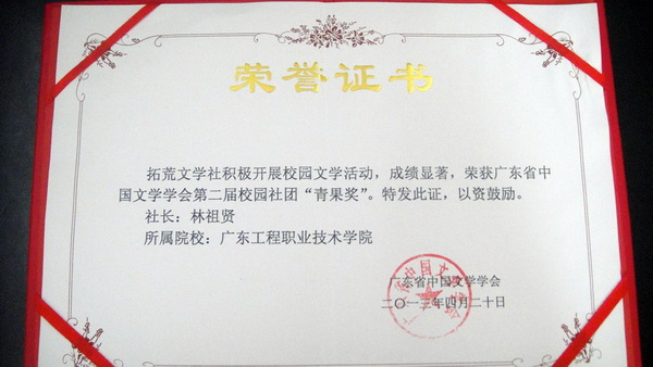 近日,廣東工程職業(yè)技術(shù)學(xué)院"拓荒文學(xué)社"在廣東省中國文學(xué)學(xué)會第二屆校園社團(tuán)評比中喜獲最高獎"青果獎"。