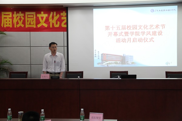 5月9日,學(xué)院第十五屆校園文化藝術(shù)節(jié)開幕式暨學(xué)院學(xué)風(fēng)建設(shè)活動月啟動儀式在圖書館報告廳舉行。出席本次活動的有學(xué)院執(zhí)行院長勞漢生教授,學(xué)院黨委副書記李軍博士,學(xué)生工作部張華部長、各院系黨支部書記、"青馬班"學(xué)生以及學(xué)院各機(jī)構(gòu)的學(xué)生干部。本活動旨在活躍校園文化,推進(jìn)學(xué)院校園文化建設(shè),提高學(xué)校的辦學(xué)品位,配合我院開展創(chuàng)建示范性高職院校工作以及落實教育部關(guān)于《中共教育部黨組關(guān)于在全國各級各類學(xué)校深入開展"我的中國夢"主題教育的通知》的相關(guān)文件要求。
