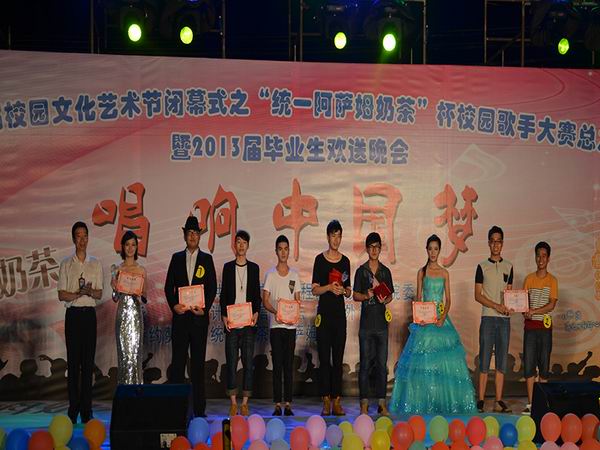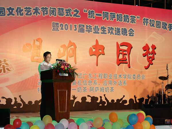 由學(xué)院團(tuán)委主辦,計(jì)算機(jī)信息系、應(yīng)用外語(yǔ)系承辦的廣東工程職業(yè)技術(shù)學(xué)院第十五屆校園文化藝術(shù)節(jié)閉幕式之"統(tǒng)一阿薩姆奶茶"杯校園歌手大賽總決賽暨2013屆畢業(yè)生歡送晚會(huì)于28號(hào)晚在學(xué)院行政樓前廣場(chǎng)華麗上演。出席本次晚會(huì)的有學(xué)院黨委副書(shū)記李軍博士、副院級(jí)領(lǐng)導(dǎo)陳杰倫副教授,各院(系)書(shū)記(副書(shū)記)以及廣州統(tǒng)一企業(yè)有限公司楊孟杰經(jīng)理、馬曉玲經(jīng)理等學(xué)院師生代表。學(xué)工部桂愛(ài)民副部長(zhǎng)、團(tuán)委黃馥麗書(shū)記、人文社科系焦英副主任、實(shí)訓(xùn)中心鄭皓丹老師和人文社科系溫潔蕓老師擔(dān)任了本次校園歌手大賽決賽的評(píng)委。院團(tuán)委施焦副書(shū)記主持了本次活動(dòng)的頒獎(jiǎng)晚會(huì)。
