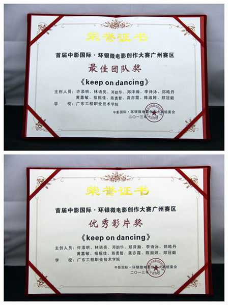 11月23日,"中影國(guó)際?環(huán)銀微電影創(chuàng)作大賽"廣州賽區(qū)決賽在廣州太陽(yáng)新天地中影國(guó)際影城落下帷幕。我院首部學(xué)生創(chuàng)作微電影《Keep on Dancing》在本次大賽中獲得最佳團(tuán)隊(duì)獎(jiǎng)及優(yōu)秀影片獎(jiǎng)。