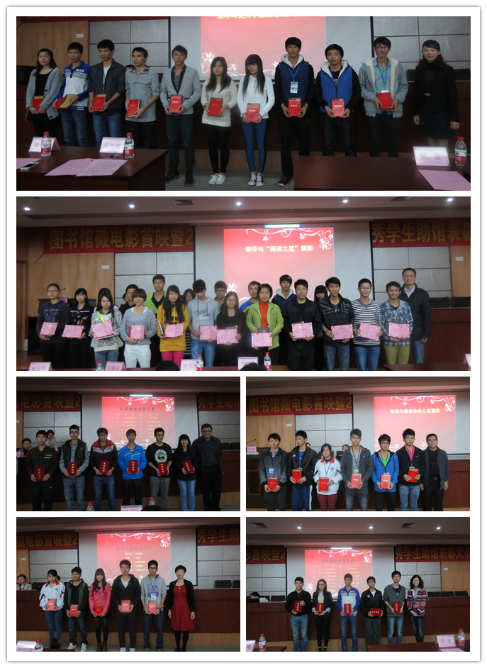 12月5日中午,圖書館2013年讀者借閱排行榜和優(yōu)秀學(xué)生助理館員表彰大會(huì)在圖書館學(xué)術(shù)報(bào)告廳召開。與會(huì)人員有學(xué)院副院長(zhǎng)胡艷曦教授、學(xué)工部桂愛民副部長(zhǎng)、院(系)領(lǐng)導(dǎo)老師代表、學(xué)生代表、獲獎(jiǎng)學(xué)生、讀者協(xié)會(huì)全體成員、圖書館全體工作人員及助理館員們。