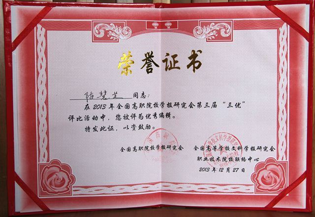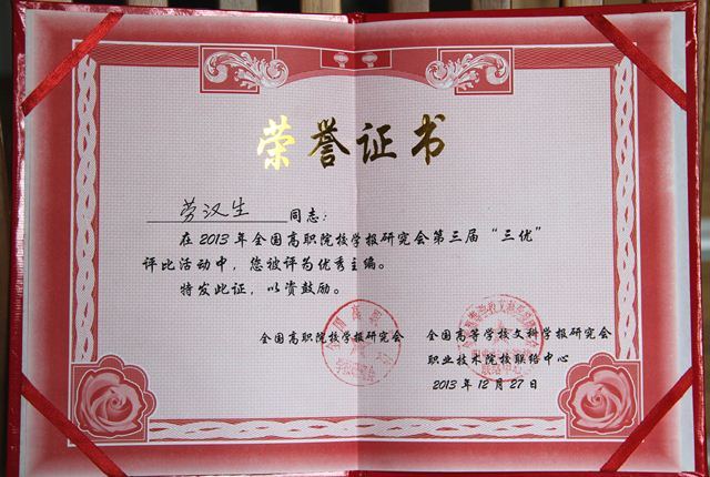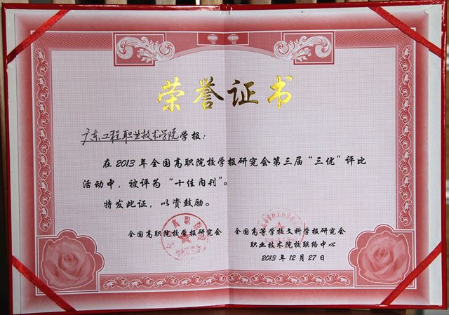 我院學(xué)報在2013年全國高職院校學(xué)報研究會第三屆"三優(yōu)"評比活動中獲評"全國十佳內(nèi)刊"。勞漢生主編獲優(yōu)秀主編獎,陳慧芝執(zhí)行主編獲優(yōu)秀編輯獎。