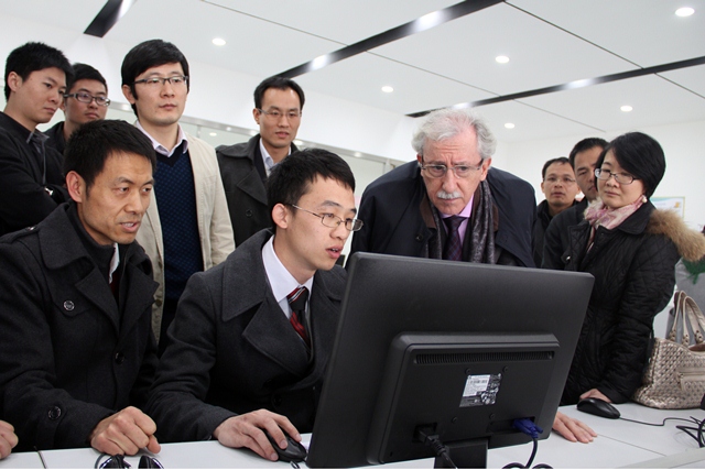 在電梯技術(shù)學(xué)院,Mr.Jorge詳細(xì)考察了該院的設(shè)計(jì)先進(jìn)、設(shè)施一流的12間多媒體和9間特種設(shè)備專業(yè)實(shí)訓(xùn)場(chǎng)地,認(rèn)真觀摩了學(xué)院自主研發(fā)的電梯3D虛擬實(shí)訓(xùn)操作平臺(tái),并與電梯技術(shù)學(xué)院教師舉行座談。