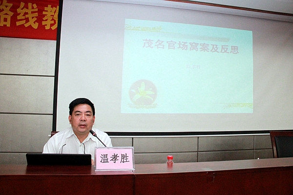 為深入貫徹《廣東省黨的群眾路線教育實踐活動總結(jié)大會精神》和習近平總書記系列重要講話精神,結(jié)合我校紀律教育學習月活動安排,10月9日下午,學校黨委副書記、紀委書記溫孝勝為學校全體黨員、科級及以上行政人員、中級及以上職稱教學教輔人員作了題為《茂名官場窩案及反思》的反腐教育專題講座。