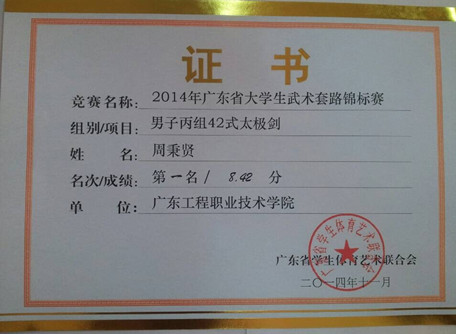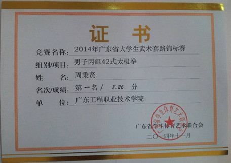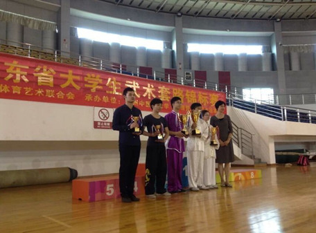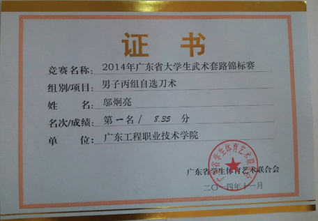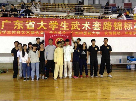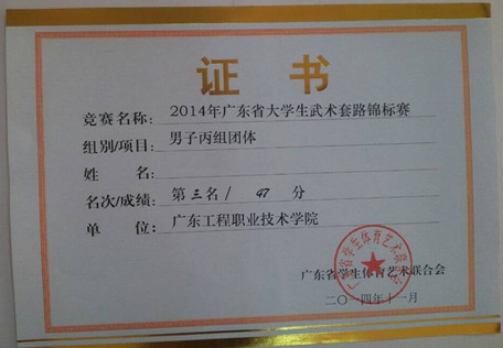 11月21-23日我院武術(shù)隊(duì)參加2014年廣東省大學(xué)生武術(shù)錦標(biāo)賽,通過組隊(duì)集訓(xùn)和賽前動員,公共課教學(xué)部別業(yè)軍主任擔(dān)任領(lǐng)隊(duì),體育教研室方永文主任為教練帶領(lǐng)我院武術(shù)隊(duì)參賽,取得三個單項(xiàng)(男子丙組自選刀術(shù)、四十二式太極拳和四十二式太極劍)的冠軍;兩個單項(xiàng)(男子丙組自選長拳和自選南拳)的第三名;一個單項(xiàng)(男子丙組自選長拳)的第四名;一個單項(xiàng)(男子丙組自選南拳)的第六名。并獲得團(tuán)體總分第三名的好成績。