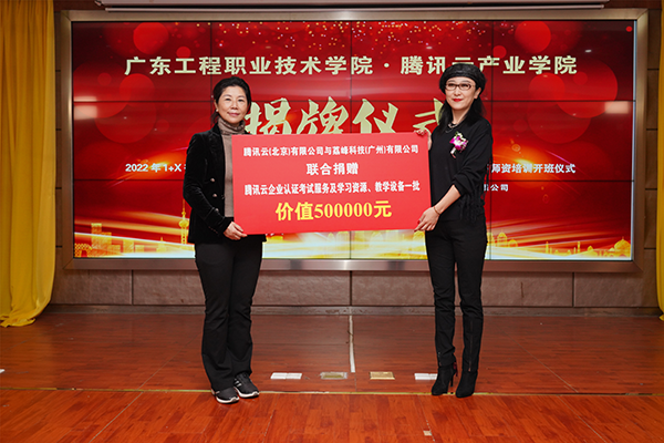 李麗校長、張莉總監(jiān)共同為“騰訊云產(chǎn)業(yè)學(xué)院”揭牌后。張莉總監(jiān)代表騰訊云(北京)有限責(zé)任公司給廣東工程職業(yè)技術(shù)學(xué)院捐贈價(jià)值50萬的物資,李麗校長代表學(xué)校接受了捐贈。