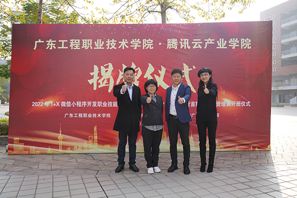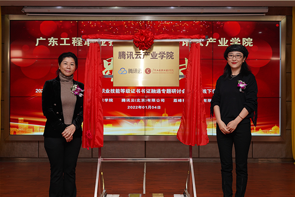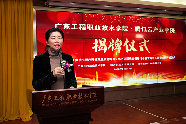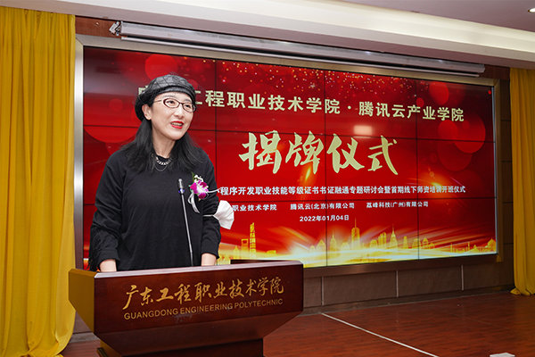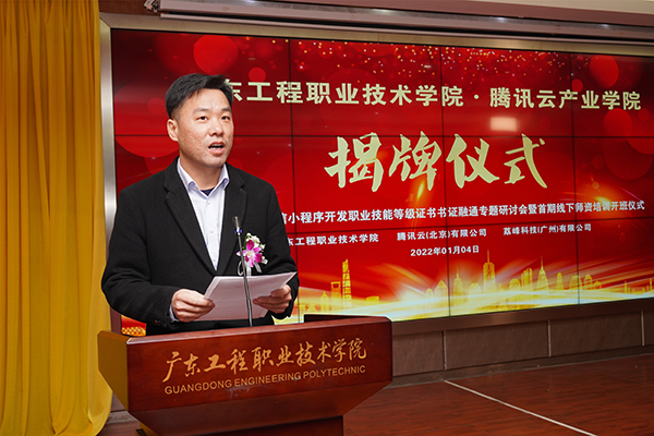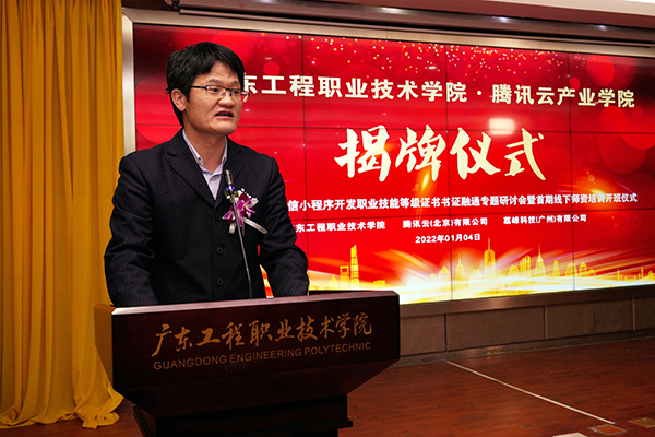 2022年1月4日上午,廣東工程職業(yè)技術(shù)學(xué)院騰訊云產(chǎn)業(yè)學(xué)院揭牌儀式在我校圖書館報(bào)告廳舉行。騰訊云計(jì)算有限責(zé)任公司校企合作中心運(yùn)營總監(jiān)張莉、高級運(yùn)營經(jīng)理李春梅、1+X證書運(yùn)營經(jīng)理熊軍、統(tǒng)信軟件技術(shù)有限公司區(qū)域總監(jiān)王興進(jìn)、廣州市漫游科技計(jì)算機(jī)有限公司總經(jīng)理?xiàng)顣晕ⅰ|軟教育科技集團(tuán)華南區(qū)總經(jīng)理樂杰、廣東時(shí)匯信息科技有限公司總經(jīng)理唐海峰、荔峰科技(廣州)有限公司總經(jīng)理肖茂財(cái)、私立華聯(lián)學(xué)院副校長崔英敏,我校校長李麗、副校長吳志敏、教務(wù)處處長陳淳慧、科技處處長鄺治全、信息工程學(xué)院院長利業(yè)韃、黨總支書記桂愛民,以及各兄弟院校教師代表和信息工程學(xué)院師生代表參加了儀式。學(xué)校副校長吳志敏主持揭牌儀式。