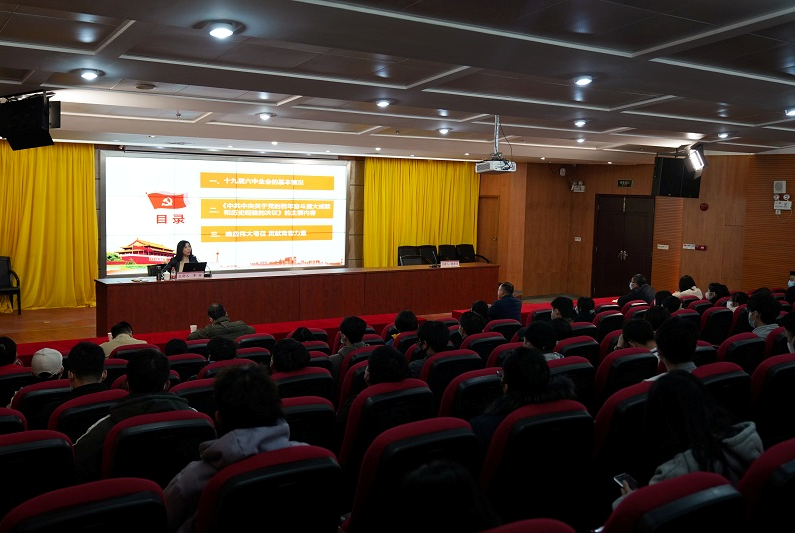 李校長以“黨的百年征程”為主線,,重點圍繞《中共中央關(guān)于黨的百年奮斗重大成就和歷史經(jīng)驗的決議》內(nèi)容,從“十九屆六中全會的基本情況”“《決議》的主要內(nèi)容”和“響應(yīng)偉大號召,貢獻(xiàn)青春力量”三方面展開,為師生們講授思政第一課。