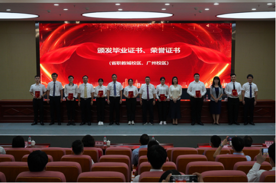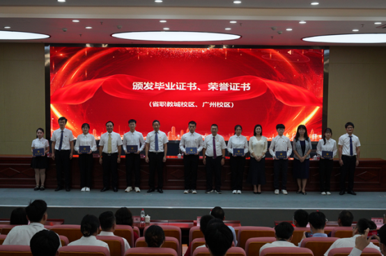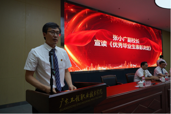 張小廣副校長宣讀了《關(guān)于表彰廣東工程職業(yè)技術(shù)學(xué)院2022屆優(yōu)秀畢業(yè)生的決定》。學(xué)校領(lǐng)導(dǎo)在主會場為優(yōu)秀畢業(yè)生代表頒獎。廣州分會場和湛江分會場同時舉行頒獎儀式。