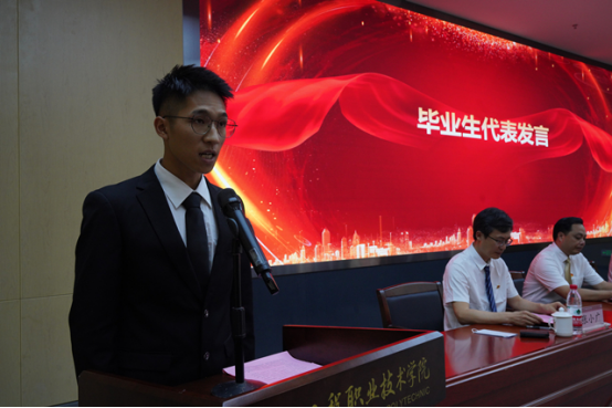 機(jī)電(電梯)工程學(xué)院李兆基同學(xué)作為畢業(yè)生代表發(fā)言,他分享了成長的喜悅,表達(dá)了對學(xué)校的辛勤培養(yǎng)和師長關(guān)心愛護(hù)的感激之情。