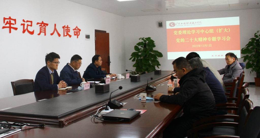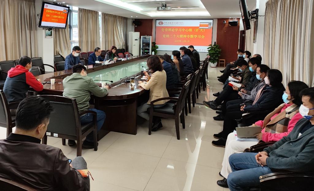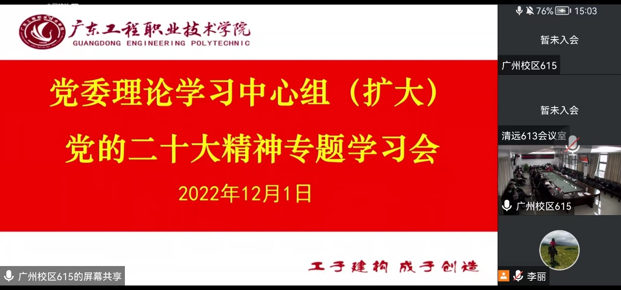 12月1日下午,學(xué)校召開黨委理論學(xué)習(xí)中心組(擴(kuò)大)學(xué)習(xí)會(huì),專題學(xué)習(xí)了黨的二十大精神。會(huì)議由學(xué)校黨委書記吳琦琳主持,黨委副書記、紀(jì)委書記徐振昌,黨委副書記方燕進(jìn)行了領(lǐng)學(xué),組織統(tǒng)戰(zhàn)部長(zhǎng)劉松梅和藝術(shù)設(shè)計(jì)學(xué)院黨總支書記張華作學(xué)習(xí)發(fā)言。全體校領(lǐng)導(dǎo)、全體中層干部參加會(huì)議,會(huì)議采用視頻連線在省職教城校區(qū)、廣州校區(qū)和騰訊會(huì)議同步舉行。
