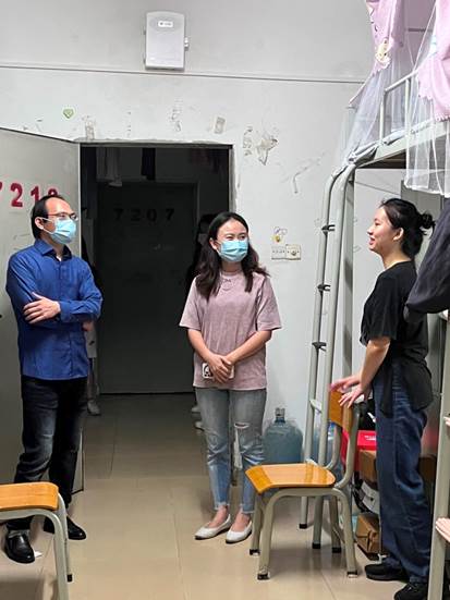 “同學(xué),做完核酸了嗎?”“同學(xué),學(xué)習(xí)生活上有什么問題隨時(shí)找我們。”“同學(xué),今天的飯還可口嗎?”……駐校值守干部職工分成12個(gè)小組,每天晚上19:30檢查校園安全和走訪學(xué)生宿舍。他們走進(jìn)了一個(gè)一個(gè)的宿舍,將同學(xué)們的每一條反饋記在心上,第一時(shí)間回應(yīng)訴求。學(xué)工部進(jìn)一步完善“樓長—層長—宿舍長”聯(lián)絡(luò)體系,建立樓長工作群、層長工作群、宿舍長工作群,形成常態(tài)“一日一報(bào)”、突發(fā)事件“急事速報(bào)”、學(xué)生訴求“接訴即辦”的工作機(jī)制。