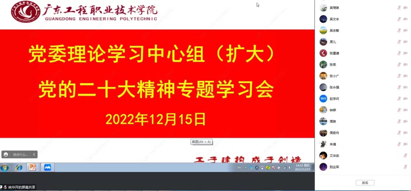 12月15日下午,學(xué)校召開黨委理論學(xué)習(xí)中心組(擴(kuò)大)學(xué)習(xí)會(huì),專題學(xué)習(xí)了黨的二十大精神。會(huì)議由學(xué)校黨委書記吳琦琳主持,黨委委員、副校長揭英榮,黨委委員、副校長吳志敏,黨委委員、副校長張小廣作了領(lǐng)學(xué)發(fā)言,信息工程學(xué)院黨總支書記桂愛民作學(xué)習(xí)發(fā)言。全體校領(lǐng)導(dǎo)、全體中層干部參加會(huì)議,會(huì)議采用騰訊視頻方式舉行。