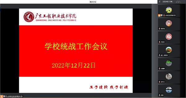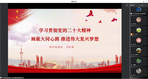 12月22日,學(xué)校通過線上方式在騰訊會(huì)議召開2022年度統(tǒng)戰(zhàn)工作會(huì)議暨黨的二十大精神宣講會(huì)。學(xué)校黨委書記吳琦琳,黨委副書記方燕,各黨總支書記(負(fù)責(zé)人)、黨總支統(tǒng)戰(zhàn)委員,學(xué)校各民主黨派、無黨派人士、在職知聯(lián)會(huì)成員及組織統(tǒng)戰(zhàn)部全體人員參加會(huì)議,會(huì)議由黨委委員、組織統(tǒng)戰(zhàn)部部長(zhǎng)劉松梅主持。