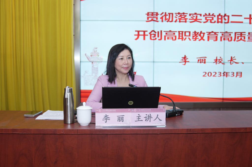 為深入學習貫徹黨的二十大精神,教育引導青年大學生全面認識和深刻把握高質(zhì)量發(fā)展的核心要義,積極投身于以高質(zhì)量發(fā)展奮力推進中國式現(xiàn)代化的新征程中去,2023年3月7日,我校校長李麗教授以“貫徹落實黨的二十大精神 開創(chuàng)高職教育高質(zhì)量發(fā)展新局面”為主題,在廣州校區(qū)圖書館學術(shù)報告廳分別講授了兩場“思政第一課”。馬克思主義學院院長郭華生、宣傳部(武裝部)負責人林華開分別主持“思政第一課”,學校黨政辦主任張永強、副主任梁英和馬克思主義學院的教師代表以及300多名同學聆聽了校長“思政第一課”。