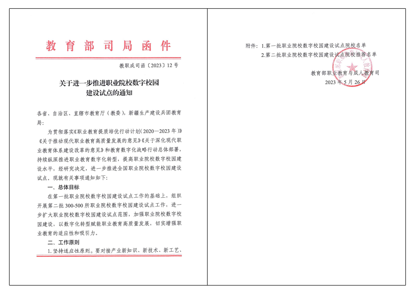 黨的二十大報告指出:“推進教育數(shù)字化,建設全民終身學習的學習型社會、學習型大國。”,職業(yè)院校數(shù)字校園建設是教育部貫徹落實《職業(yè)教育提質培優(yōu)行動計劃(2020-2023年)》《關于推動現(xiàn)代職業(yè)教育高質量發(fā)展的意見》《關于深化現(xiàn)代職業(yè)教育體系建設改革的意見》和教育數(shù)字化戰(zhàn)略行動總體部署,是持續(xù)縱深推進職業(yè)教育數(shù)字化轉型的有效抓手,學校的入選將極大地提升學校數(shù)字校園建設水平。