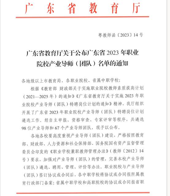 根據(jù)《廣東省教育廳關(guān)于公布廣東省2023年職業(yè)院校產(chǎn)業(yè)導(dǎo)師(團隊)名單的通知》(粵教師函〔2023〕14號),在廣東省教育廳組織的2023年職業(yè)院校產(chǎn)業(yè)導(dǎo)師(團隊)特聘崗位計劃的申報中,我校軟件技術(shù)專業(yè)產(chǎn)業(yè)導(dǎo)師龔霖迪、建筑室內(nèi)設(shè)計專業(yè)產(chǎn)業(yè)導(dǎo)師羅威被遴選為廣東省2023年職業(yè)院校產(chǎn)業(yè)導(dǎo)師。