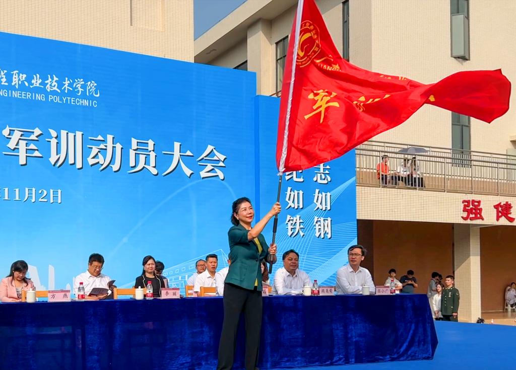 沙場秋點兵。校長李麗向兩校區(qū)軍訓團教官代表張定根、陳廣清團長授軍訓團團旗。紅旗如火,揮舞的旗幟點燃了青春的熱烈和軍訓的激情。