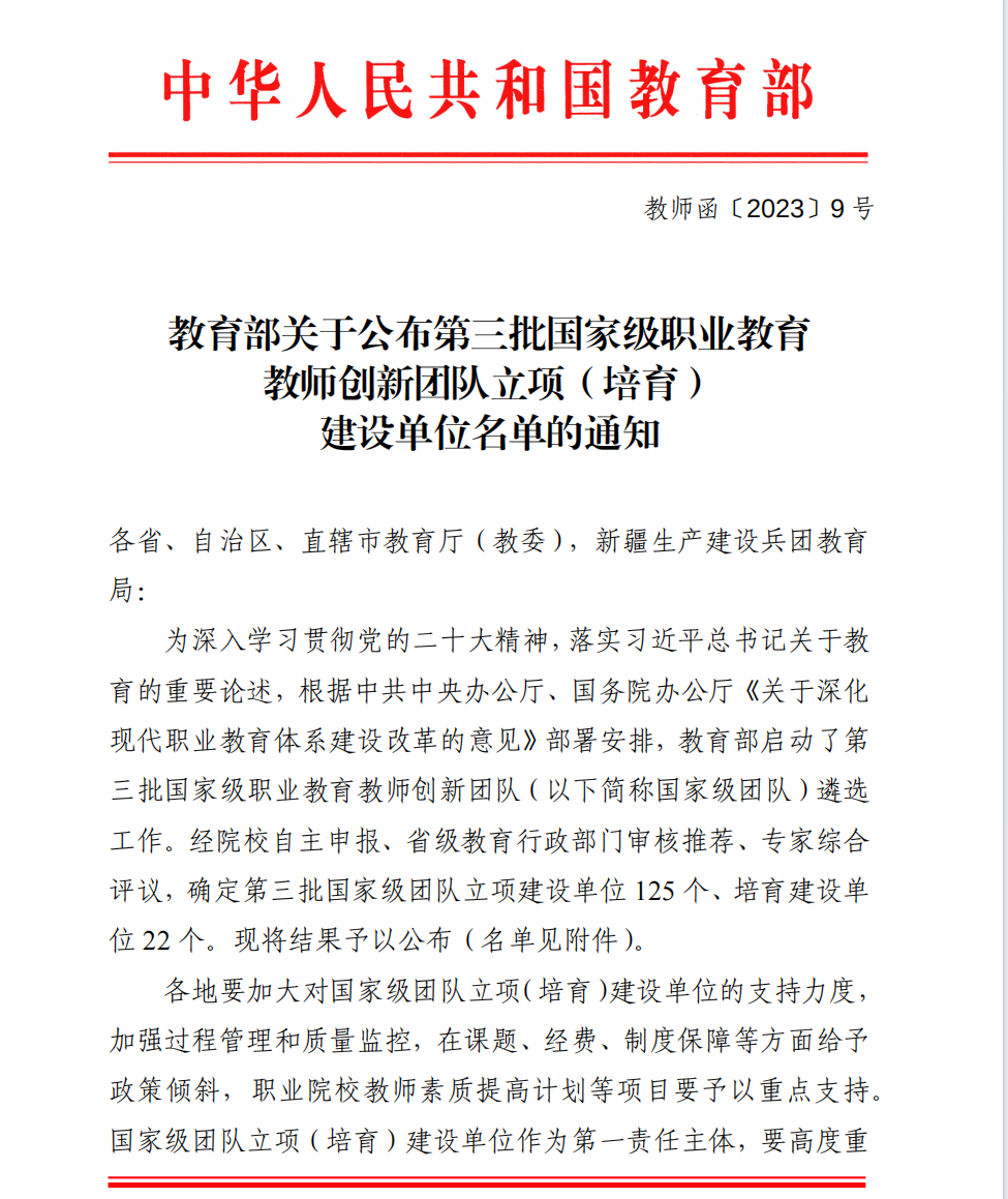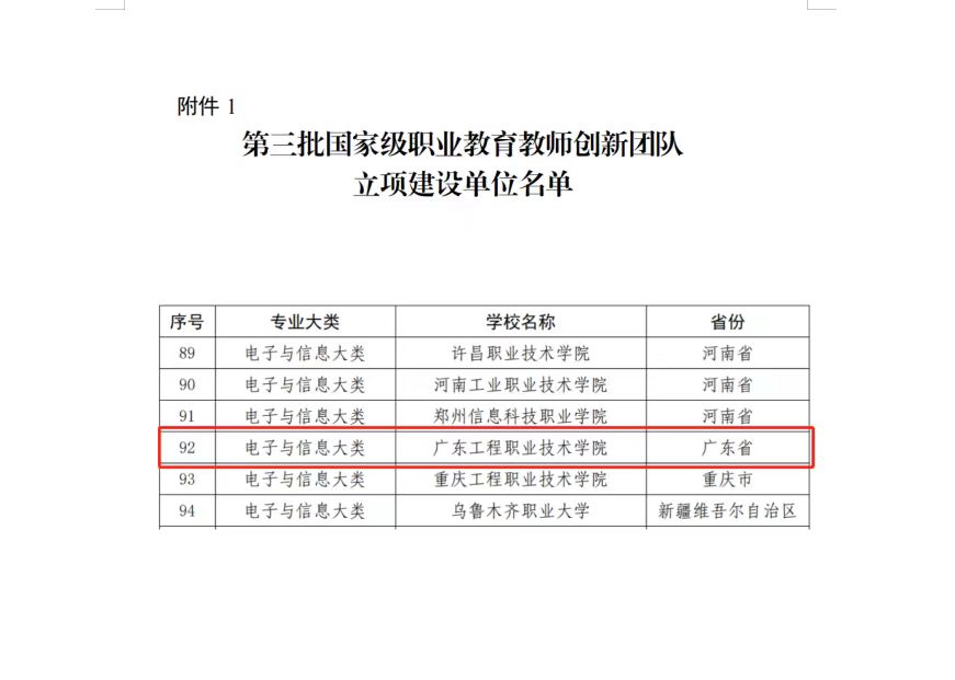 根據(jù)《教育部關于公布第三批國家級職業(yè)教育教師創(chuàng)新團隊立項(培育)建設單位名單的通知》,我校被確定為第三批國家級職業(yè)教育教師創(chuàng)新團隊立項建設單位,朱珍軟件技術專業(yè)教師創(chuàng)新團隊為國家級職業(yè)教育教師創(chuàng)新建設團隊,此次國家級職業(yè)教育教師創(chuàng)新團隊立項建設單位全國共計125個,其中廣東省9個,我校為廣東省唯一一個電子與信息大類立項建設單位,這是我校在“雙高校”建設和高質量發(fā)展中取得的又一項國家級標志性成果。