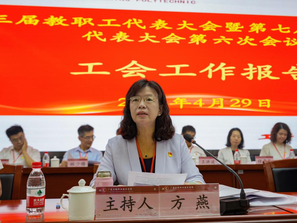 方燕代表學(xué)校第七屆工會委員會作題為《改革創(chuàng)新促發(fā)展 團結(jié)奮進譜新篇》的工會工作報告。