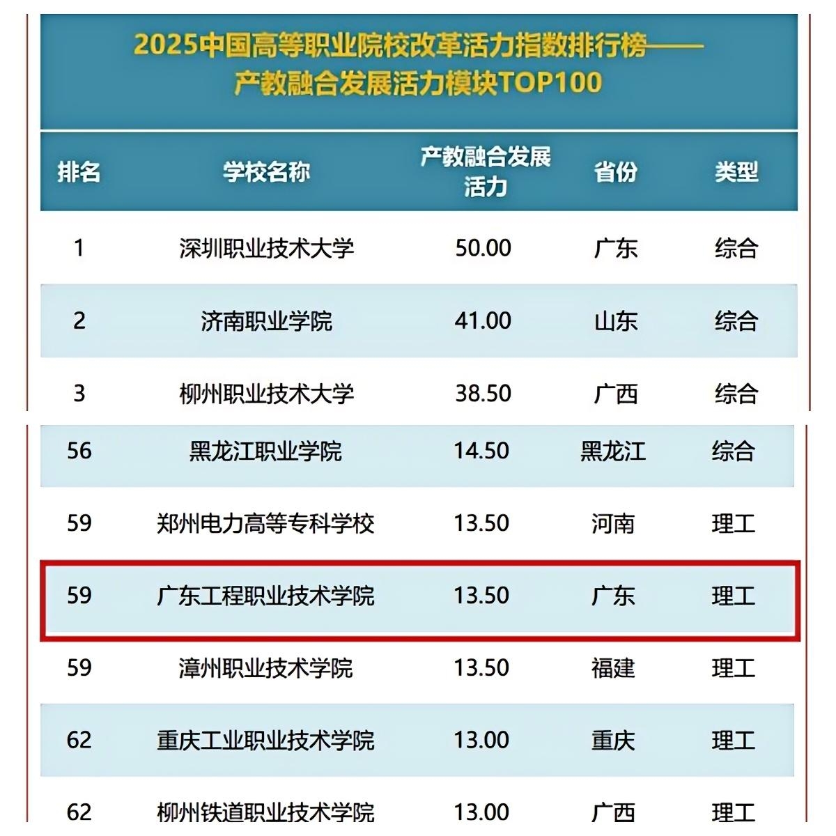 5月28日,高職發(fā)展智庫正式發(fā)布“2025中國高等職業(yè)院校改革活力指數(shù)排行榜”(以下簡稱“活力指數(shù)排行榜”)。我校名列產(chǎn)教融合發(fā)展活力模塊TOP100第59位,廣東省高職院校第11位,進一步肯定了我校推動產(chǎn)教融合、校企合作所取得成果成效。