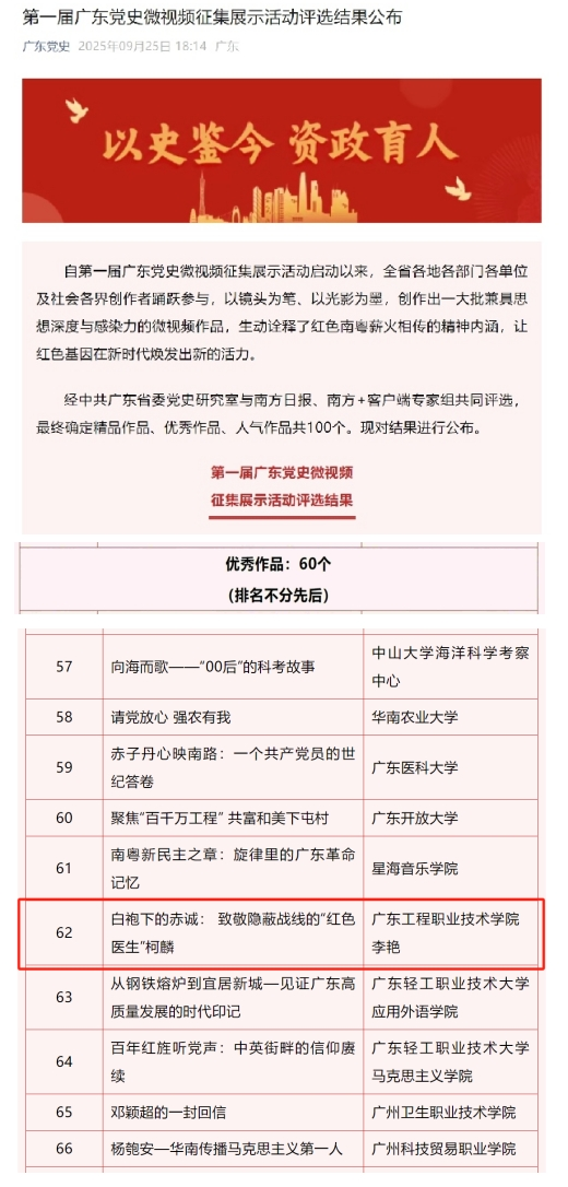 近日,第一屆廣東黨史微視頻征集展示活動(dòng)評(píng)選結(jié)果正式揭曉,我校馬克思主義學(xué)院教師李艷創(chuàng)作的微視頻《白袍下的赤誠(chéng):致敬隱蔽戰(zhàn)線的“紅色醫(yī)生”柯麟》榮獲“優(yōu)秀作品”獎(jiǎng)。該作品以我校首任校長(zhǎng)柯麟同志的光輝事跡為藍(lán)本,展現(xiàn)出了柯麟同志堅(jiān)定的理想信念、無私奉獻(xiàn)的精神和高尚的醫(yī)德。
