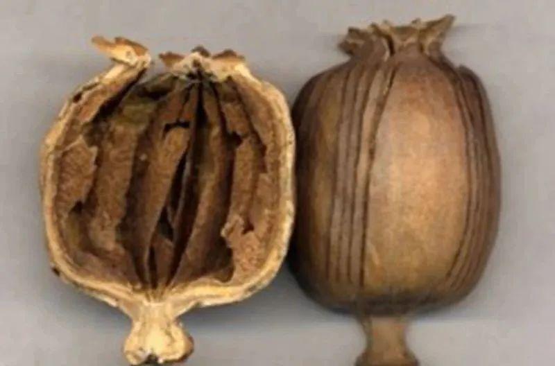 ▲罌粟殼外觀為棗核形,如鴿子蛋大小,一頭尖,另一頭呈6-14瓣冠狀物。其殼體上往往有人為切割的多道刀痕。