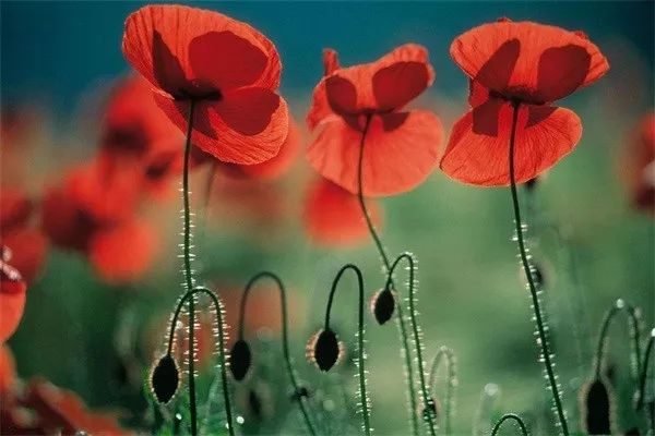 罌粟的花瓣有重瓣的,顏色多是紅色,邊緣會開裂。罌粟花的花朵比較大,花徑就達到了10厘米,用手觸摸花瓣會覺得比較厚實,而且它還很有光澤。