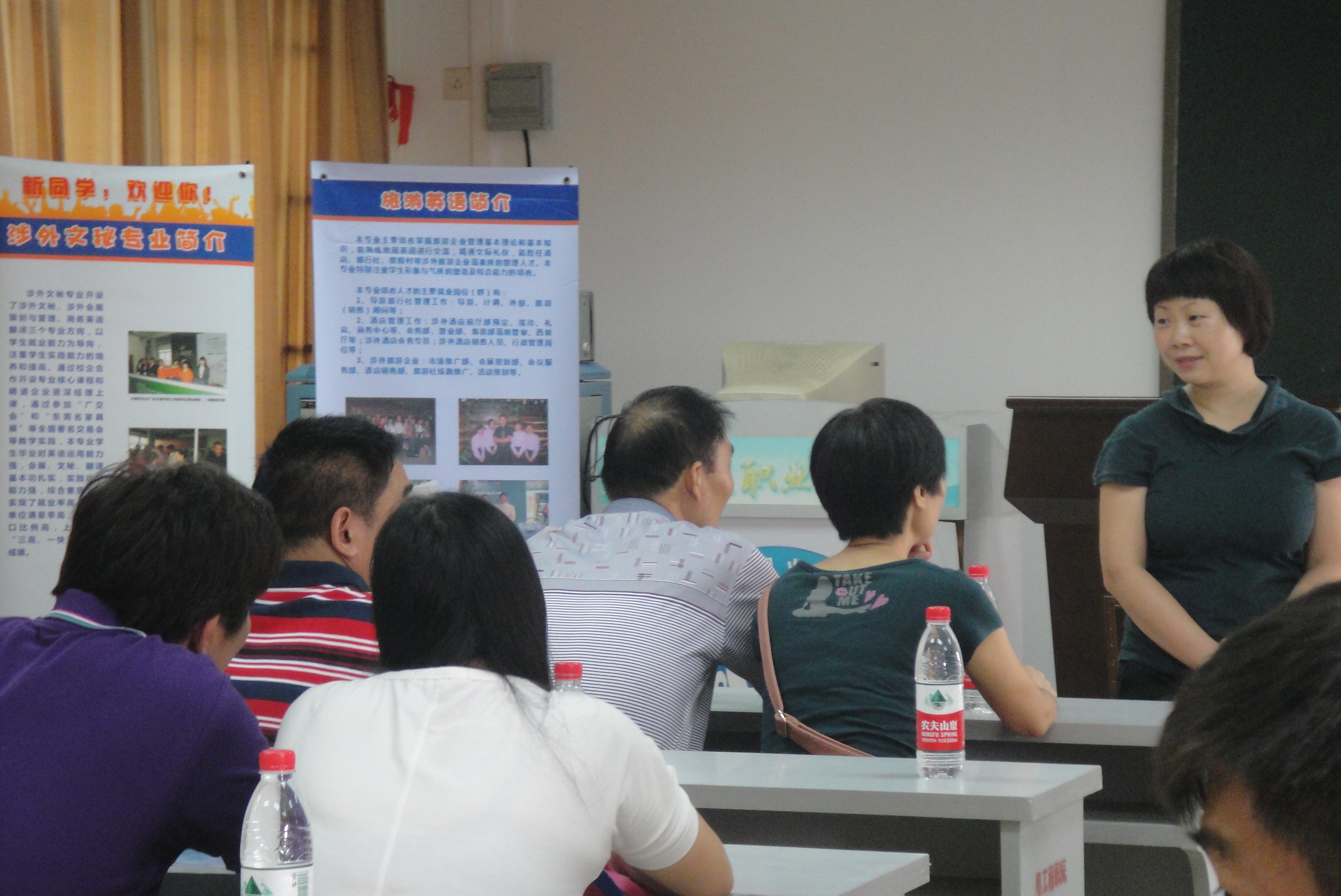2012年9月9日新生報到當天,下午15:00外語系已經(jīng)報到新生200多人,一些家長應(yīng)邀或主動參加外語系新生家長見面會,甘利主任、胡新副主任、吳麗清書記、四個教研室主任(董建霞老師、陳志旗老師、陳坤儀老師、舒立志老師)、輔導員、班主任在1002室熱情接待了新生及家長代表,師生及家長真誠溝通,就同學未來三年的學習、校園生活、班級建設(shè),頂崗實習,就業(yè)前景進行廣泛交流。