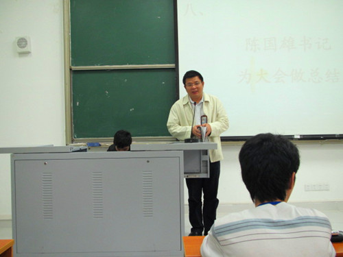 最后,陳國雄書記對本次會議做了總結發(fā)言。他代表學院歡迎2012級新生加入建工學生機構大家庭,感謝2011級的學生干部們按時保質、保量地完成了本次迎新工作。并對學生干部的成長提出了三點希望:一是繼承傳統(tǒng),服務同學;二是率先垂范,爭先創(chuàng)優(yōu);三是激揚青春,迸發(fā)激情。鼓勵學生干部團結一心,并肩作戰(zhàn),用飽滿的激情去迎接未來的挑戰(zhàn),攜手共創(chuàng)學院美好未來!