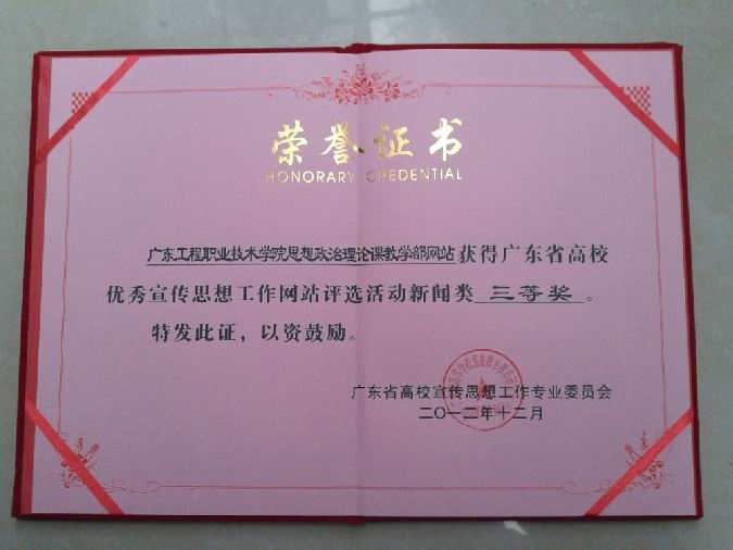 我院思政部網(wǎng)站在2012年廣東省高校優(yōu)秀宣傳思想工作網(wǎng)站展示活動(dòng)中獲得三等獎(jiǎng)