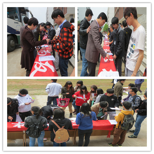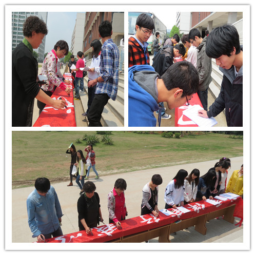 4月12日上午,"書香伴我行,我以書為友"簽名活動和"圖書館讀者借閱排行榜"啟動活動在圖書館大樓門前舉行,拉開了本次4.23讀書活動月的序幕。學院領(lǐng)導胡艷曦副院長、院學生工作部的老師們、圖書館老師們、院讀者協(xié)會會員以及眾多師生參加了活動并在"讀書活動月"宣傳條幅上簽名。