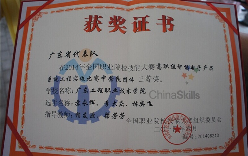 2014年6月24日全國(guó)職業(yè)院校技能大賽高職組 "智能電子產(chǎn)品系統(tǒng)工程實(shí)施"項(xiàng)目在天津現(xiàn)代職業(yè)技術(shù)學(xué)院拉開序幕。我校機(jī)電工程學(xué)院的學(xué)子以全省第二名的佳績(jī)代表廣東參加全國(guó)技能大賽,于6月23日在張新政院長(zhǎng)的帶領(lǐng)下一行七人直奔天津,與來(lái)自全國(guó)各省的近百支隊(duì)伍同場(chǎng)競(jìng)技一較高低。經(jīng)過(guò)大家的共同努力,由賴友源老師和梁芳芳老師共同指導(dǎo)的由李大慶,蘇永輝,林奕飛三位學(xué)生組成的"廣東一隊(duì)"在本次的國(guó)家級(jí)大賽中以總分第18名成績(jī)榮獲 "全國(guó)三等獎(jiǎng)"。