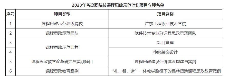 近日,廣東省教育廳發(fā)布了《關(guān)于公布2023年省高職院校課程思政示范計(jì)劃項(xiàng)目立項(xiàng)名單的通知》,我校獲批立項(xiàng)2023年省高職院校課程思政示范高職院校,另有4大類5個(gè)項(xiàng)目獲省課程思政示范計(jì)劃立項(xiàng),其中,課程思政示范團(tuán)隊(duì)1個(gè)、課程思政示范課程2門、課程思政教學(xué)改革研究與實(shí)踐項(xiàng)目1項(xiàng)和課程思政教育案例1個(gè)。