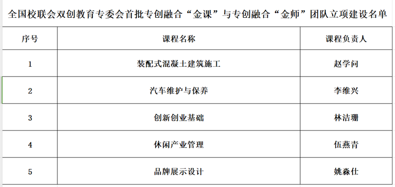 近日,全國(guó)高等職業(yè)學(xué)校校長(zhǎng)聯(lián)席會(huì)議雙創(chuàng)教育專(zhuān)委會(huì)公布了首批專(zhuān)創(chuàng)融合“金課”與專(zhuān)創(chuàng)融合“金師”團(tuán)隊(duì)立項(xiàng)建設(shè)名單,根據(jù)全國(guó)高等職業(yè)學(xué)校校長(zhǎng)聯(lián)席會(huì)議雙創(chuàng)教育專(zhuān)委會(huì)《關(guān)于遴選建設(shè)高等職業(yè)學(xué)校專(zhuān)創(chuàng)融合“金課”與專(zhuān)創(chuàng)融合“金師”團(tuán)隊(duì)的通知》有關(guān)要求,經(jīng)評(píng)審遴選,我校推薦申報(bào)的《裝配式混凝土建筑施工》等5門(mén)課程被確定為全國(guó)高等職業(yè)學(xué)校校長(zhǎng)聯(lián)席會(huì)議雙創(chuàng)教育專(zhuān)委會(huì)首批專(zhuān)創(chuàng)融合“金課”與專(zhuān)創(chuàng)融合“金師”團(tuán)隊(duì)項(xiàng)目立項(xiàng)建設(shè)。