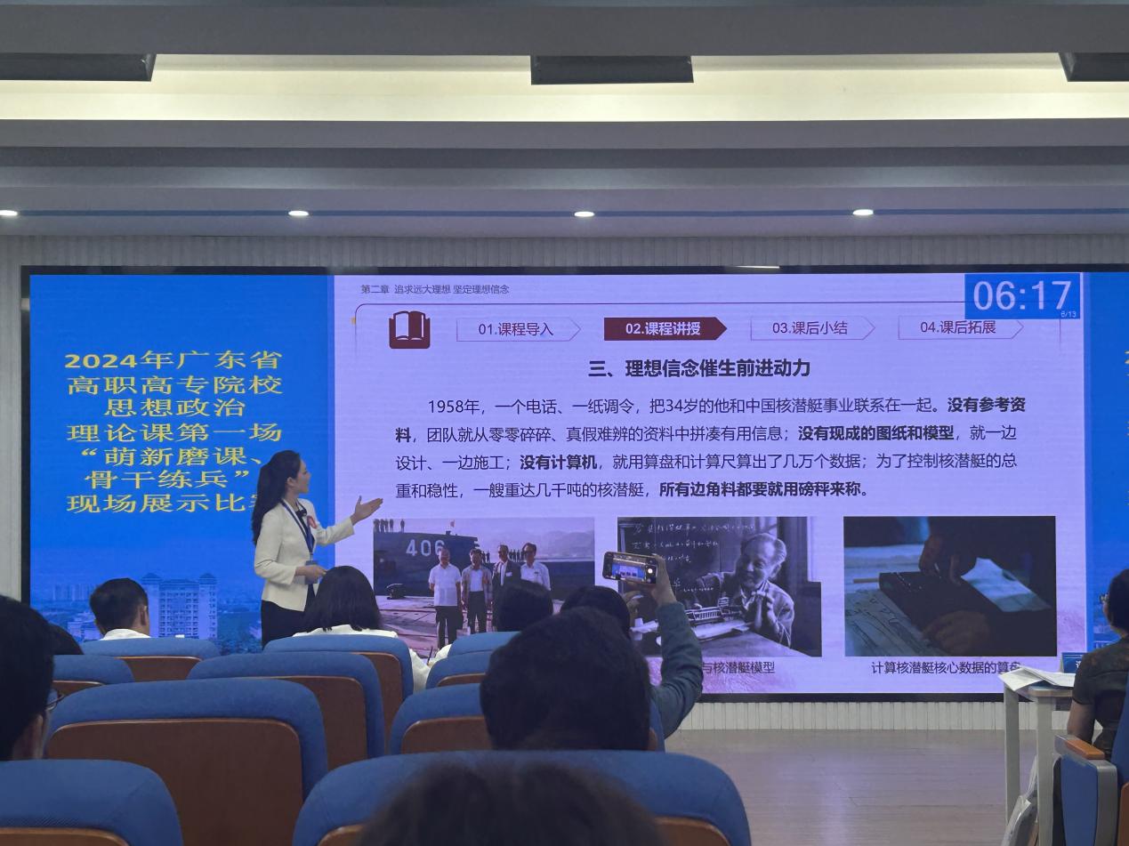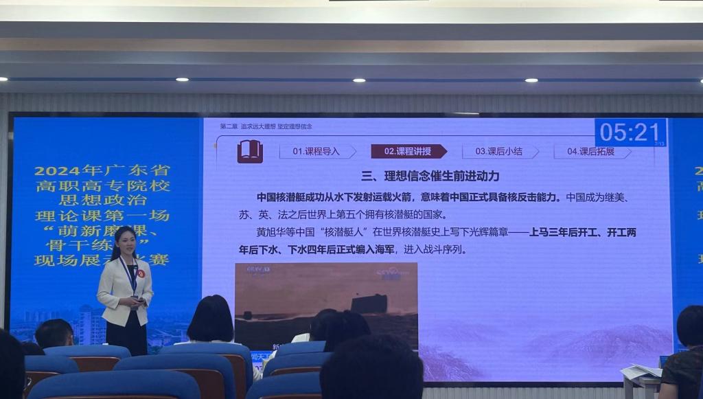來自廣東省內(nèi)十所高職院校的優(yōu)秀青年教師同臺(tái)競(jìng)技,經(jīng)過激烈的角逐,我校馬克思主義學(xué)院青年教師李雨獲得“萌新磨課”組現(xiàn)場(chǎng)展示比賽一等獎(jiǎng)。在決賽中,李雨老師以《理想信念催生前進(jìn)動(dòng)力》為主題,將情景演繹、朗誦等形式融入課堂中,通過講述“中國核潛艇之父”黃旭華的事跡感悟理想信念的力量,從而激勵(lì)青年學(xué)生持續(xù)堅(jiān)定理想信念,厚植愛國情懷,強(qiáng)化責(zé)任擔(dān)當(dāng)。