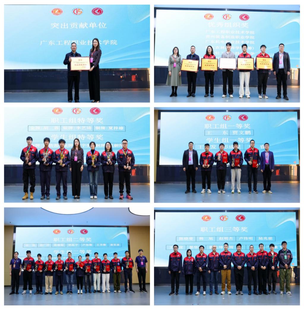 經(jīng)過激烈角逐,大賽產(chǎn)生特等獎(金銀銅牌各1名)、一、二、三等獎和優(yōu)勝獎等若干名。人工智能學院胡蓉老師勇奪職工組特等獎,摘得金牌。夏梓雄老師、周文老師分別獲得特等獎銅牌和三等獎。2023級工業(yè)機器人技術(shù)專業(yè)學生梁朝澤、邱文昊分別獲得學生組特等獎銅牌和二等獎,與此同時,學校榮獲大賽突出貢獻單位和優(yōu)秀組織獎。