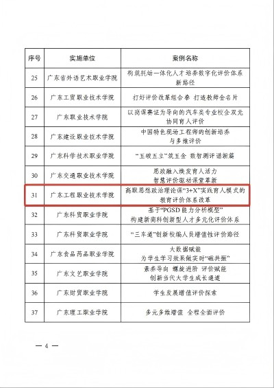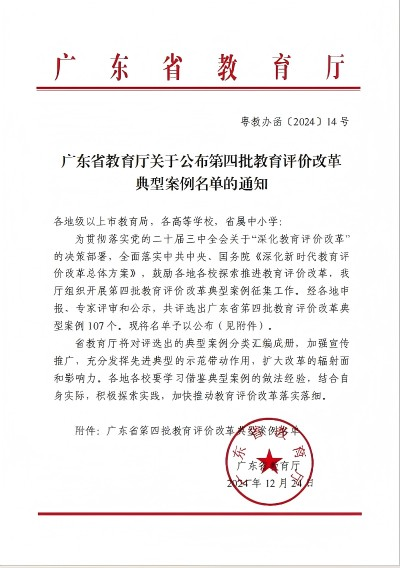 為貫徹落實黨的二十屆三中全會關(guān)于“深化教育評價改革” 的決策部署,全面落實中共中央、國務(wù)院《深化新時代教育評價改革總體方案》,鼓勵各地各校探索推進(jìn)教育評價改革,今年8月廣東省教育廳組織開展第四批教育評價改革典型案例征集工作。12月24日,經(jīng)各地申報、專家評審和公示,共評選出廣東省第四批教育評價改革典型案例 107 個,我校馬克思主義學(xué)院副院長柏欣主筆的案例《高職思想政治理論課“3+X”實踐育人模式的教育評價體系改革》成功入選。