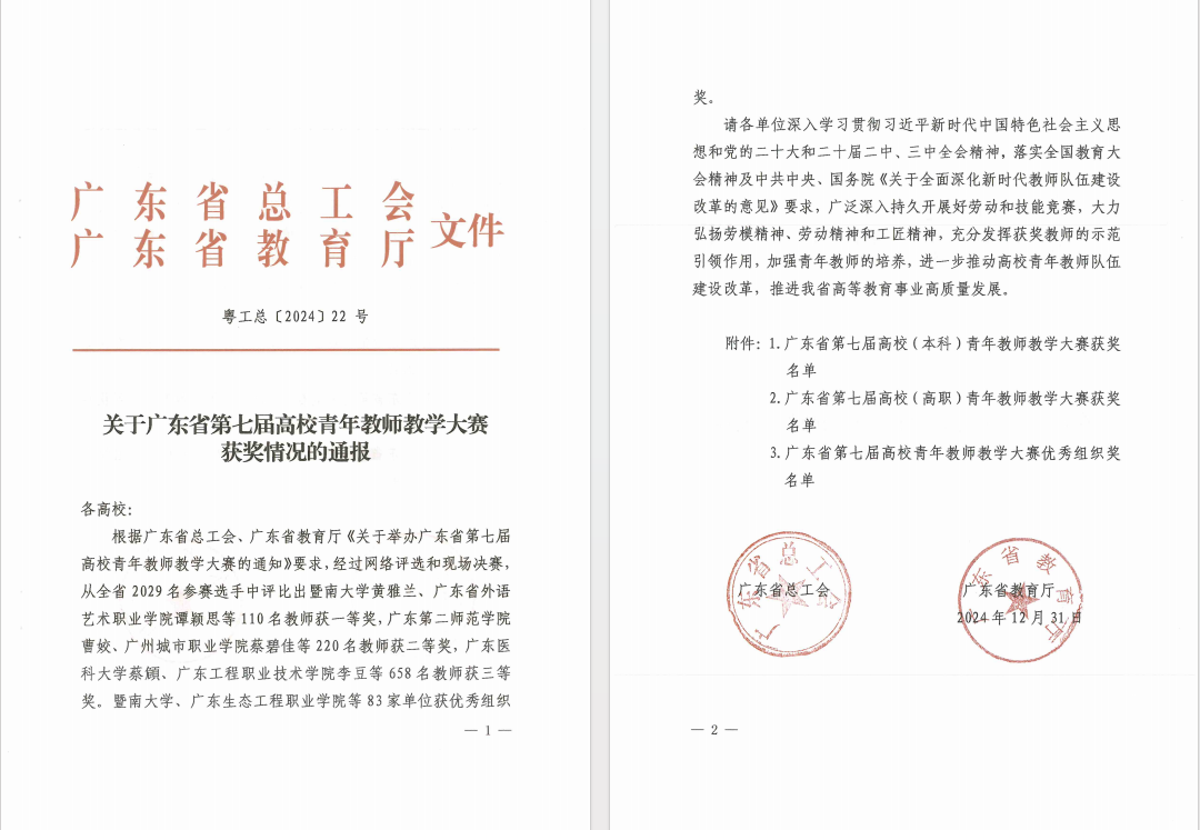 近日,喜訊傳來,我校在剛剛落幕的廣東省第七屆高校(高職)青年教師教學大賽中取得了驕人成績。我校共有16位青年教師脫穎而出,分別在不同組別中斬獲獎項,其中,酒店管理學院陳曉容和人工智能學院呂烈尉兩位老師獲得一等獎;馬克思主義學院李艷、商務學院李夢溪、財經學院廖春萍、公共服務學院曹卉、藝術設計學院徐諶榕、李源雨、溫潔蕓、建筑工程學院丘穗敏和機電工程學院吳穎苗9位老師獲得二等獎;馬克思主義學院李豆、機電工程學院李維興、人工智能學院周文、建筑工程學院林曉慶和建筑工程學院孫天瑋5位老師獲得三等獎。充分展示了我校青年教師的專業(yè)素養(yǎng)與教學創(chuàng)新能力。同時,學校也因其卓越的組織工作被授予“優(yōu)秀組織獎”,這是對我校整體教學質量及管理水平的高度認可。