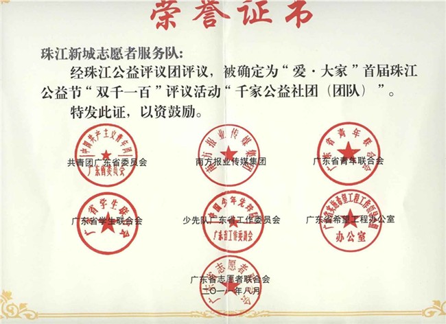 廣東工程職業(yè)技術(shù)學(xué)院團委從2011年4月份承接了廣州"幸福小屋"花城廣場一號站,成立了珠江新城志愿者服務(wù)隊,在廣東省首屆珠江公益節(jié)"雙千一百"推薦評議活動獲得"愛.大家"首屆珠江公益節(jié)公益社團(團隊)稱號。